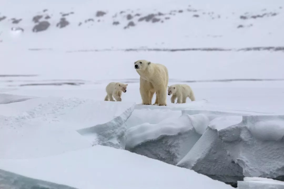 阎述学:当然了,一般都是北极熊妈妈带着两个北极熊宝宝在附近散步。我来考考你,你知道北极熊身上厚厚的毛发是什么颜色的吗?
