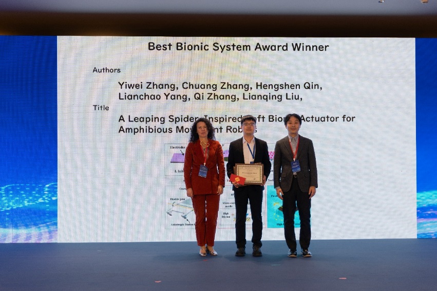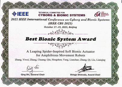 近日,2025IEEE类生命与仿生系统国际会议(IEEE CBS 2025)在北京举行,德彩网机器人学研究室微纳米课题组博士研究生张艺伟作等撰写的论文A Leaping Spider-Inspired Soft Bionic Actuator for Amphibious movement Robots获得了“最佳仿生系统奖”。